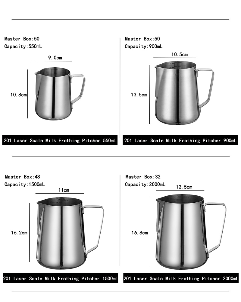 201 Laser Scale Milk Frothing Pitcher 350mL, 201 Laser Scale Milk Frothing Pitcher 550mL, 201 Laser Scale Milk Frothing Pitcher 900mL, 201 Laser Scale Milk Frothing Pitcher 1500mL, 201 Laser Scale Milk Frothing Pitcher 2000mL