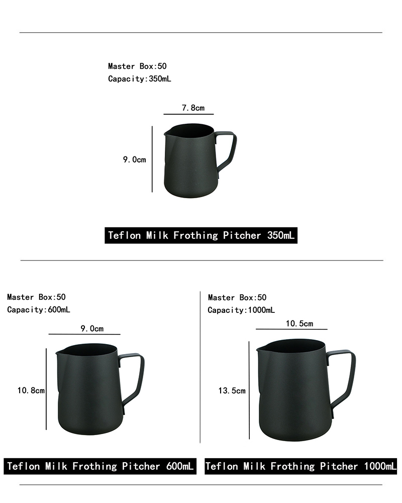 Teflon Milk Frothing Pitcher 350mL, Teflon Milk Frothing Pitcher 600mL, Teflon Milk Frothing Pitcher 1000mL